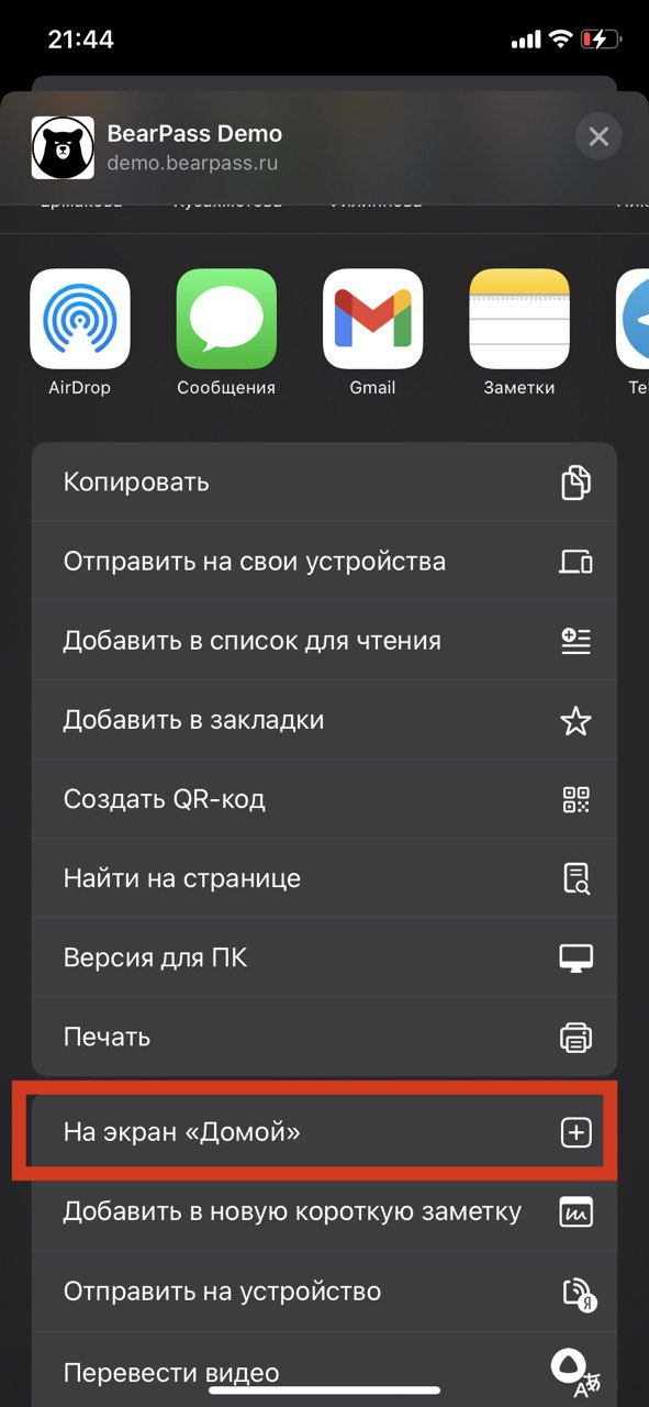 В Safari или Google Chrome откройте сайт с парольным менеджером и нажмите на иконку "Поделиться".